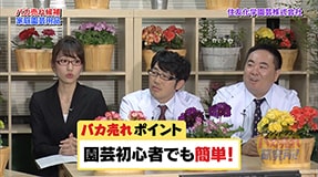 今回のバカ売れ商品候補は、家庭でキレイなお花を咲かせる、住友化学園芸の「家庭園芸用品」。マンションでも栽培ができ日々の生活に癒やしや潤いを与えてくれる園芸。使用すると誰でも気軽に楽しめるという園芸用品の数々にドランクドラゴンの鈴木拓、塚地武雅も興味津々!実は園芸男子だった本田ひでゆき(本田兄妹)が園芸初心者の本田あやの(本田兄弟)に苗、鉢選びから、鉢植えまでをレクチャーするVTRでは、いつもと違う手際の良さを見せる本田ひでゆきにスタジオ一同が驚き!最後にスタジオで、バカ売れメンバーそれぞれをイメージした鉢植えを目の前に塚地武雅の母性が目覚める??
