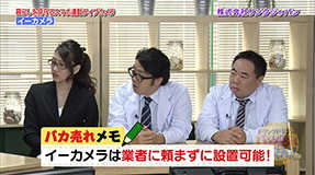 設定も設置も業者に依頼する必要もないほど簡単!台に乗せるのはもちろん、冷蔵庫や天井にもくっつけられる「イーカメラ」にスタジオ大興奮!!しかも録画機能やナイトビジョンにも対応!!